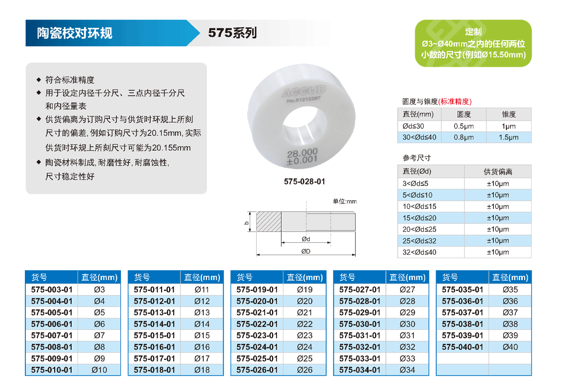 简短描述: ♦ 符合标准精度 ♦ 用于设定内径千分尺、三点内径千分尺 和内径量表 ♦ 供货偏离为订购尺寸与供货时环规上所刻 尺寸的偏差, 例如订购尺寸为20.15mm, 实际 供货时环规上所刻尺寸可能为20.155mm ♦ 陶瓷材料制成, 耐磨性好, 耐腐蚀性, 尺寸稳定性好