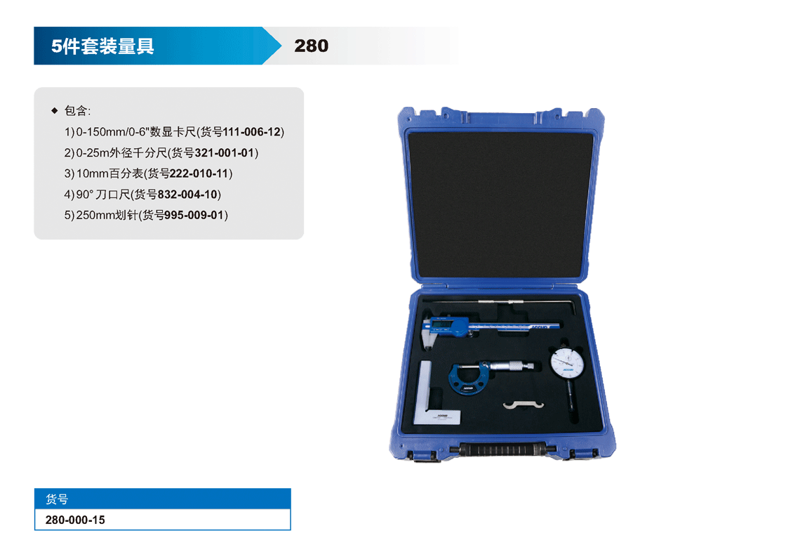 简短描述: ♦ 包含: 1) 0-150mm/0-6"数显卡尺(货号111-006-12) 2) 0-25m外径千分尺(货号321-001-01) 3) 10mm百分表(货号222-010-11) 4) 90° 刀口尺(货号832-004-10) 5) 250mm划针(货号995-009-01)