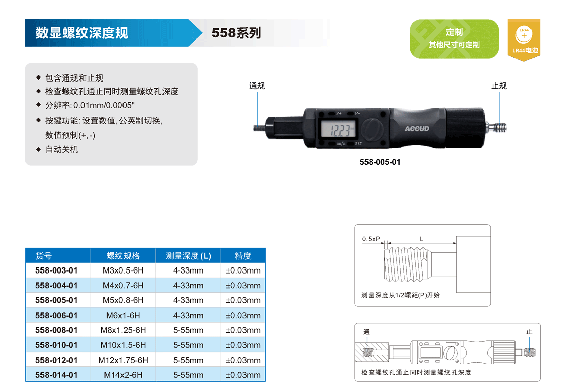 简短描述: ♦ 包含通规和止规 ♦ 检查螺纹孔通止同时测量螺纹孔深度 ♦ 分辨率: 0.01mm/0.0005" ♦ 按键功能: 设置数值, 公英制切换, 数值预制(+, -) ♦ 自动关机
