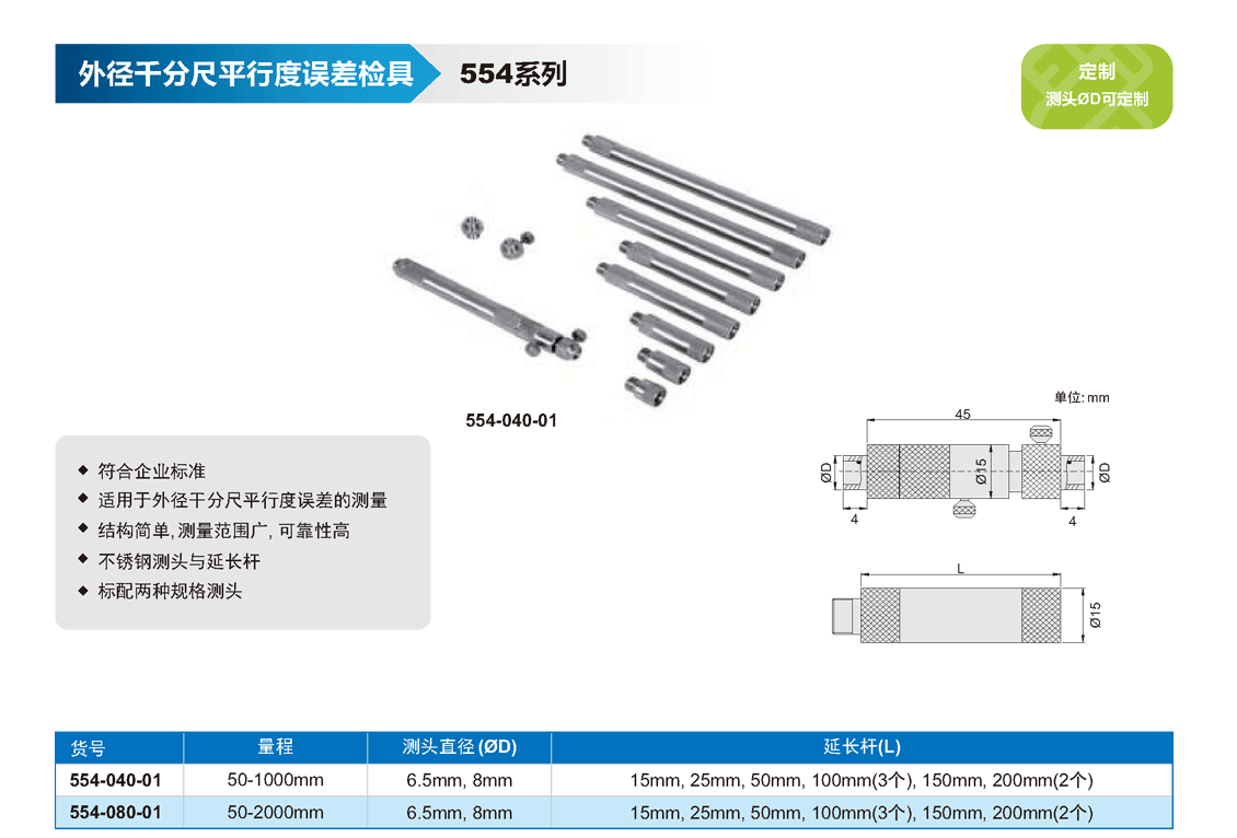 简短描述: ♦ 符合企业标准 ♦ 适用于外径干分尺平行度误差的测量 ♦ 结构简单, 测量范围广, 可靠性高 ♦ 不锈钢测头与延长杆 ♦ 标配两种规格测头