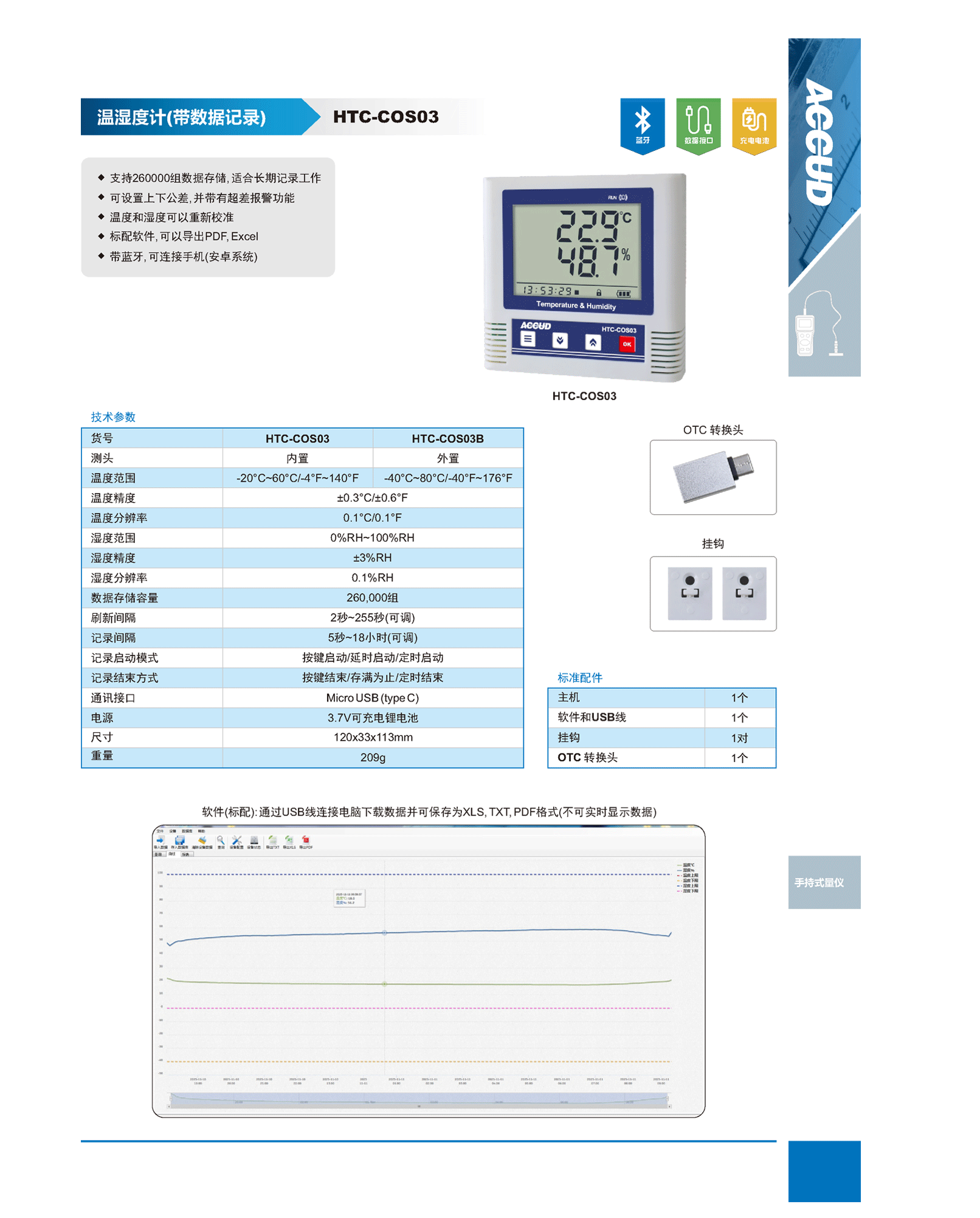 简短描述: ♦ 支持260000组数据存储, 适合长期记录工作 ♦ 可设置上下公差, 并带有超差报警功能 ♦ 温度和湿度可以重新校准 ♦ 标配软件, 可以导出PDF, Excel ♦ 带蓝牙, 可连接手机(安卓系统)