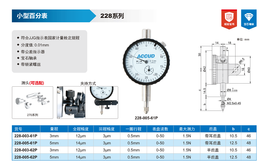 简短描述: ♦ 符合JJG指示表国家计量检定规程 ♦ 分度值: 0.01mm ♦ 带公差指示器 ♦ 宝石轴承 ♦ 带锁紧螺丝