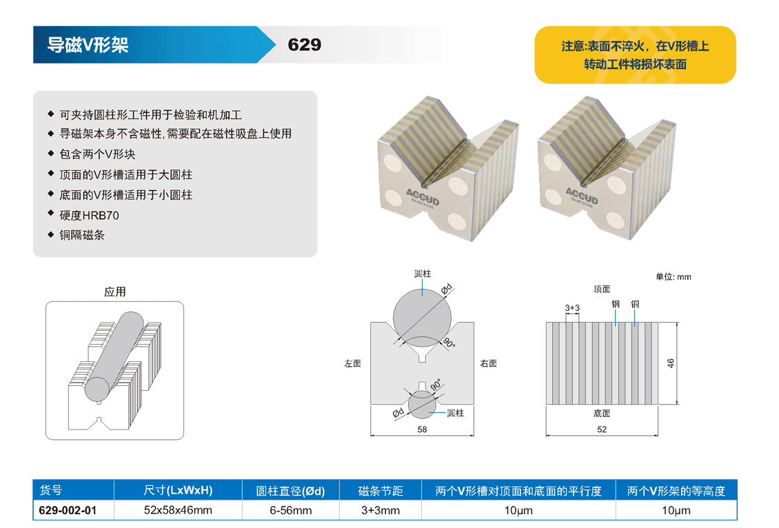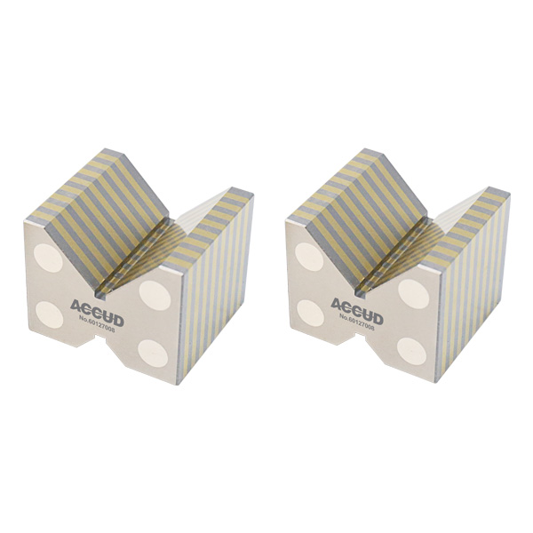 简短描述: ♦ 可夹持圆柱形工件用于检验和机加工 ♦ 导磁架本身不含磁性, 需要配在磁性吸盘上使用 ♦ 包含两个V形块 ♦ 顶面的V形槽适用于大圆柱 ♦ 底面的V形槽适用于小圆柱 ♦ 硬度HRB70 ♦ 铜隔磁条