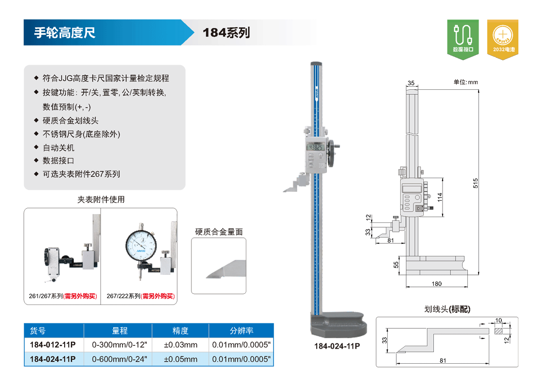 简短描述: ♦ 符合JJG高度卡尺国家计量检定规程 ♦ 按键功能: 开/关, 置零, 公/英制转换, 数值预制(+, -) ♦ 硬质合金划线头 ♦ 不锈钢尺身(底座除外) ♦ 自动关机 ♦ 数据接口 ♦ 可选夹表附件267系列