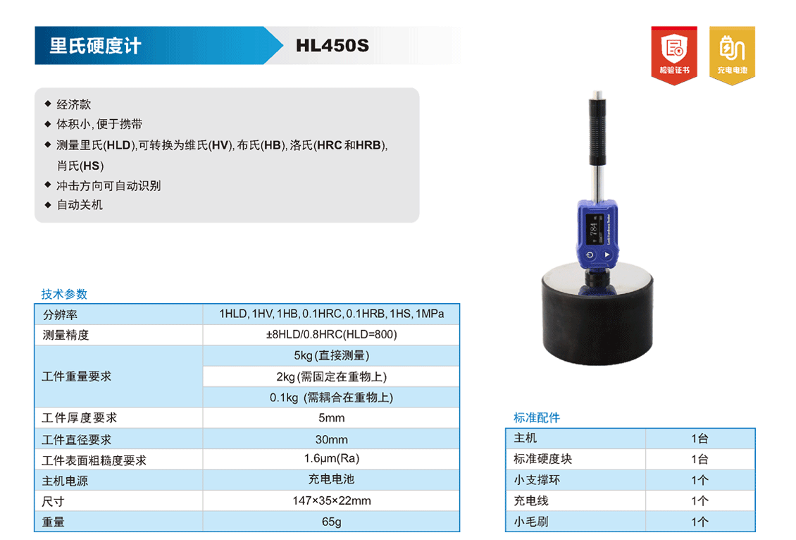 简短描述: ♦ 经济款 ♦ 体积小, 便于携带 ♦ 测量里氏(HLD),可转换为维氏(HV), 布氏(HB), 洛氏(HRC 和HRB),肖氏(HS) ♦ 冲击方向可自动识别 ♦ 自动关机