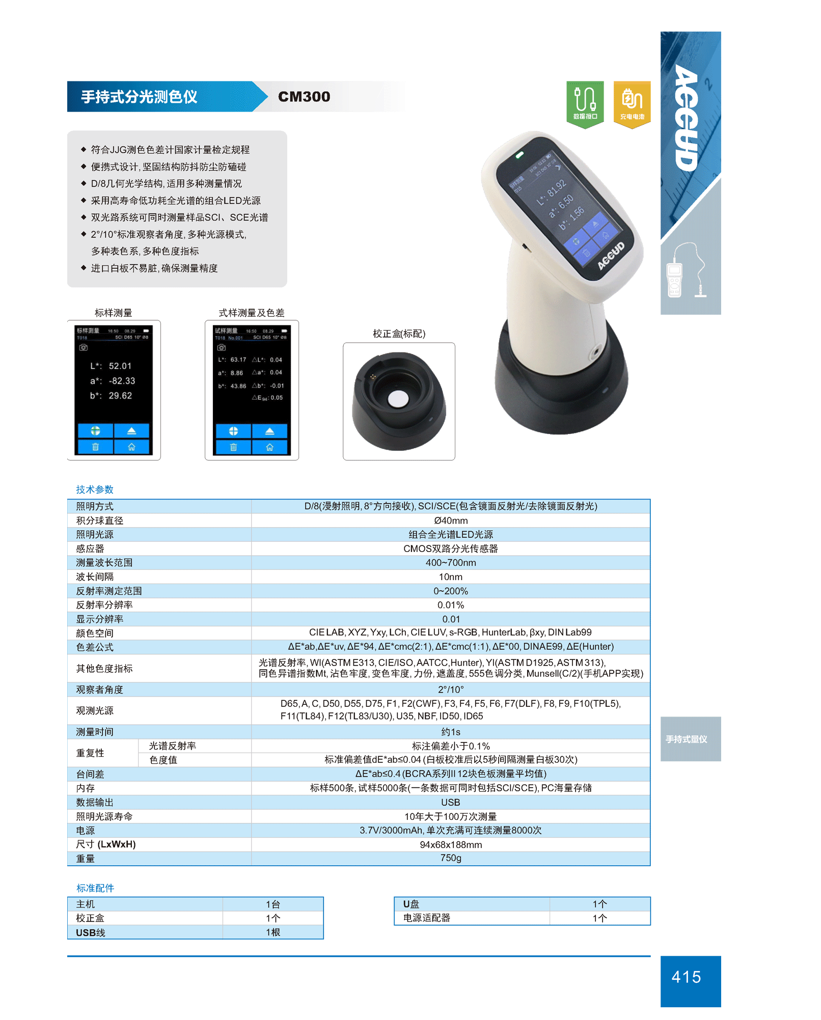 简短描述: ♦ 符合JJG测色色差计国家计量检定规程 ♦ 便携式设计, 坚固结构防抖防尘防磕碰 ♦ D/8几何光学结构, 适用多种测量情况 ♦ 采用高寿命低功耗全光谱的组合LED光源 ♦ 双光路系统可同时测量样品SCI、SCE光谱 ♦ 2°/10°标准观察者角度, 多种光源模式, 多种表色系, 多种色度指标 ♦ 进口白板不易脏, 确保测量精度