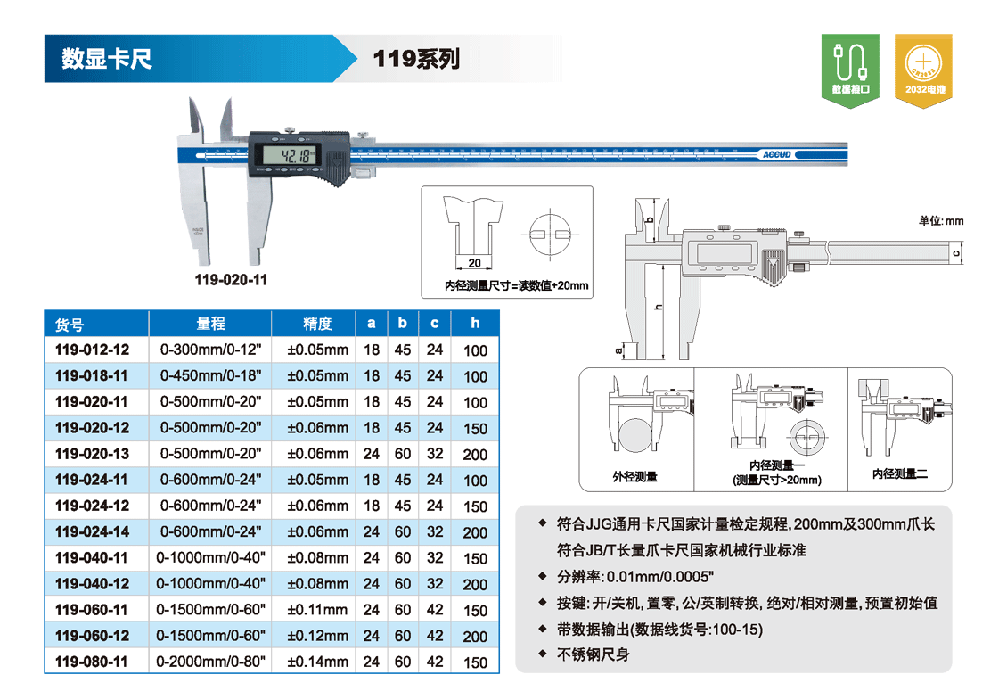 简短描述: ♦ 符合JJG通用卡尺国家计量检定规程, 200mm及300mm爪长 符合JB/T长量爪卡尺国家机械行业标准 ♦ 分辨率: 0.01mm/0.0005" ♦ 按键功能: 开关机, 置零, 公英制转换, 绝对/相对测 量, 预置初始值 ♦ 带数据输出(数据线货号:100-15) ♦ 不锈钢尺身